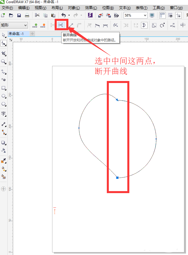 3、移動好后,選擇中間的兩點(diǎn),點(diǎn)擊屬性欄中的斷開曲線,斷開曲線后,它還是一個整體。這時候,選擇工具箱中的選擇工具,在屬性欄中找到拆分。拆分后,取消選擇,然后點(diǎn)擊右半部分,按Delete鍵刪除。