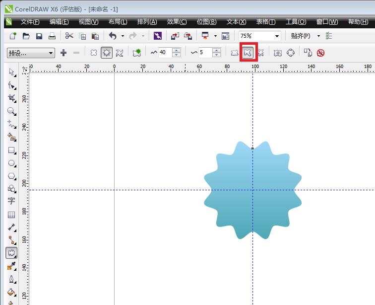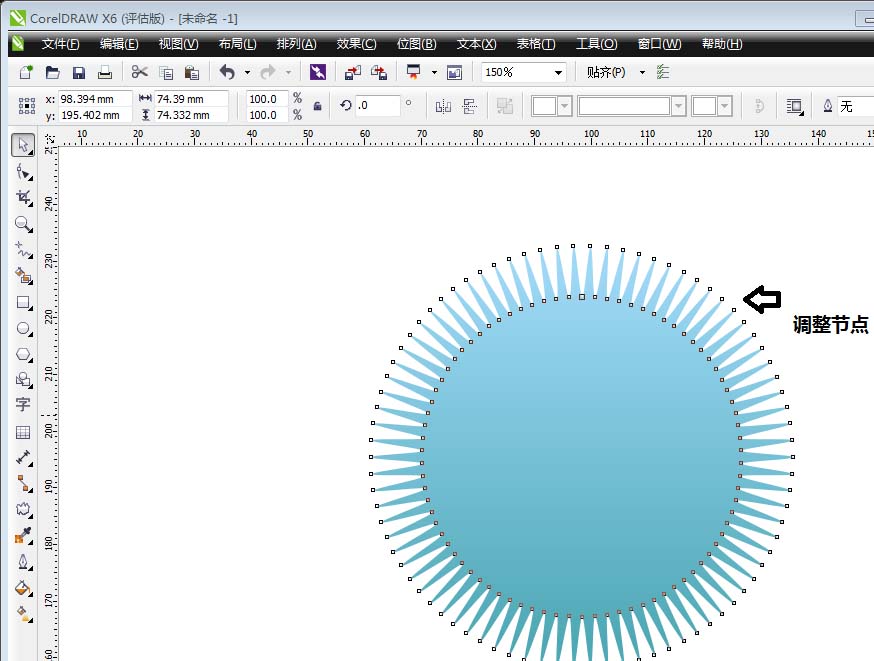 4、在屬性欄中選擇“拉鏈變形”,用標(biāo)尺鎖定圓形的中心點(diǎn),點(diǎn)住鼠標(biāo)往右邊移,那么圓形就長(zhǎng)出角來(lái),再點(diǎn)擊“平滑變形”,那么就角度會(huì)變得光滑。