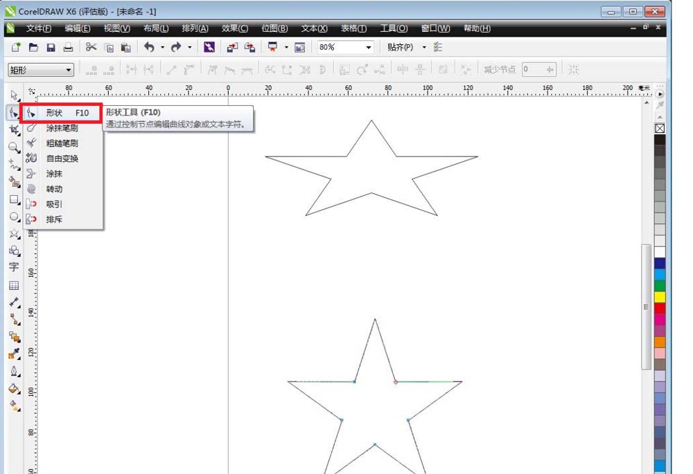 3、回到工具欄中,選擇工具欄中的“形狀工具”中的“形狀”按鈕,來改變星形的形狀。