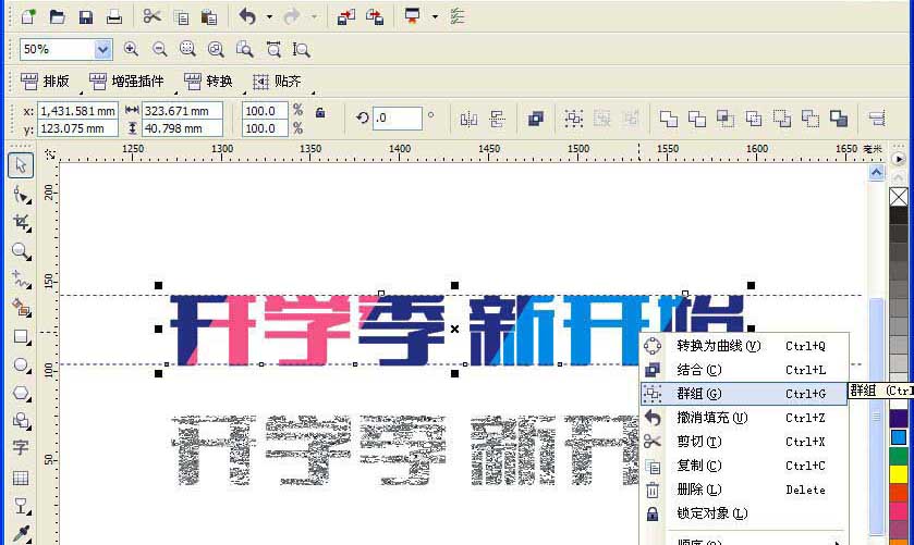 5、群組,帶色塊文字,如圖,然后全選,選擇“排列”——“對齊和分布”——“水平居中對齊”(底紋文字在上層)