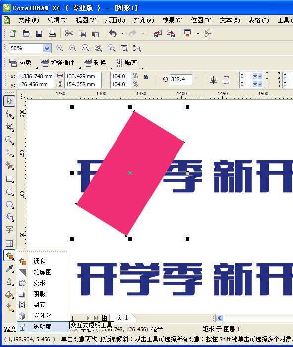 5、設置“交互式透明工具”效果的參數,如圖紅色框所示,咱們可以看到,矩形透明度發生了變化。