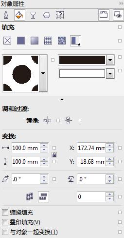 4. 變換:從上到下依次是填充寬度、填充高度、傾斜、水平位置、垂直位置和旋轉。填充寬度和填充高度可以設置用于填充圖案的單元圖案的大小;水平位置和垂直位置的設置可以使圖案進行填充后相對于圖形的位置發(fā)生變化;傾斜和旋轉可以使單元圖案產(chǎn)生相應的傾斜和旋轉效果。