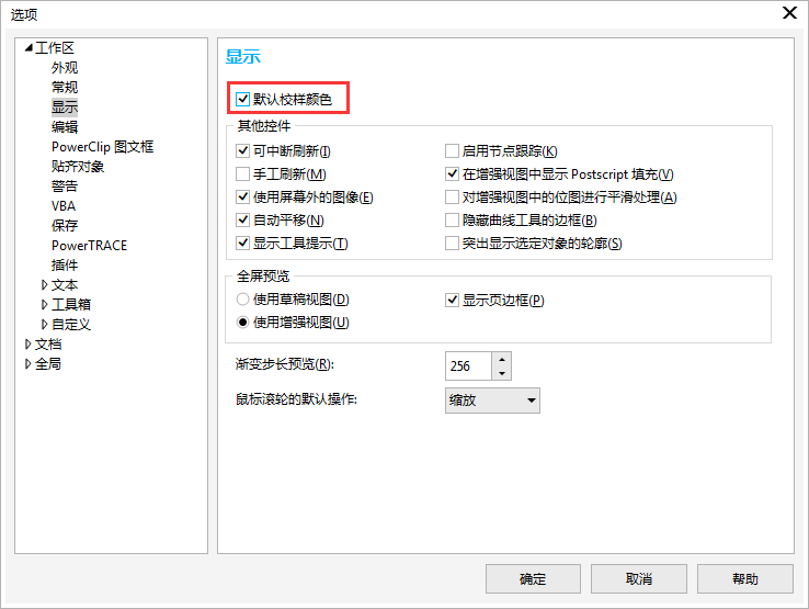 按下快捷鍵Ctrl+J,彈出“選項”對話框,單開左側面板“工作區>顯示”,在“顯示”子面板中勾選“默認校樣顏色”,單擊確定即可。