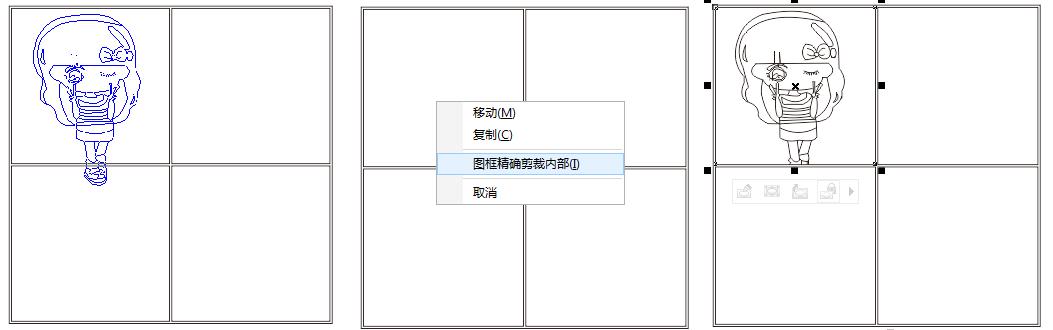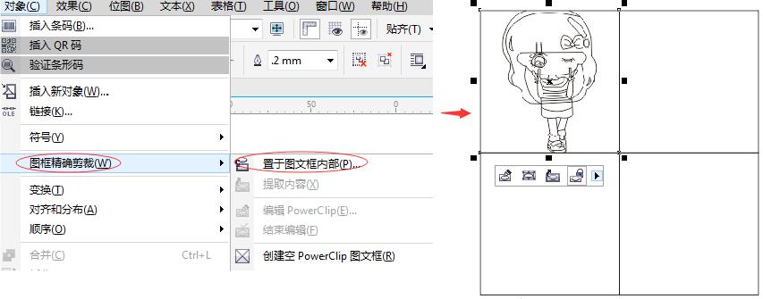 點選圖片,“對象”>“圖框精確剪裁”>“置于圖文框內部”。(注:這個方法不適用于表格,可以換成圖紙來做,出來的效果相同。)