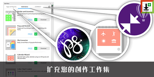 通過直接在 CorelDRAW 和 Corel PHOTO-PAINT 中免費下載或購買應用程序、插件和擴展,擴展創新工具的集合。您可以下載 Corel Website Creator 的免費許可證,購買 AfterShot Pro 以獲得極致的 RAW 工作流程,體驗 Corel ParticleShop 的卓越位圖效果等等。為了訪問此創新工具集合,您需要連接到因特網。