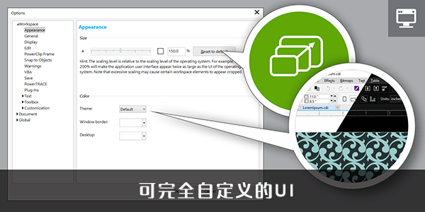 CorelDRAW Graphics Suite X8 提供比以往更多的 UI 自定義選項,使您可以定制設計空間來創建獨特的工作環境。全新重新設計的圖標允許放大 250%,并且您可以通過選擇主題來變亮或變暗應用程序背景。