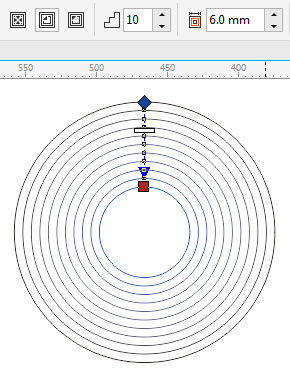 單擊選擇工具箱中的“輪廓圖工具”,根據需要,設置輪廓圖類型,調整輪廓圖步長和輪廓圖偏移數值,如圖所示,同樣也可以進行圖形的“拆分”。