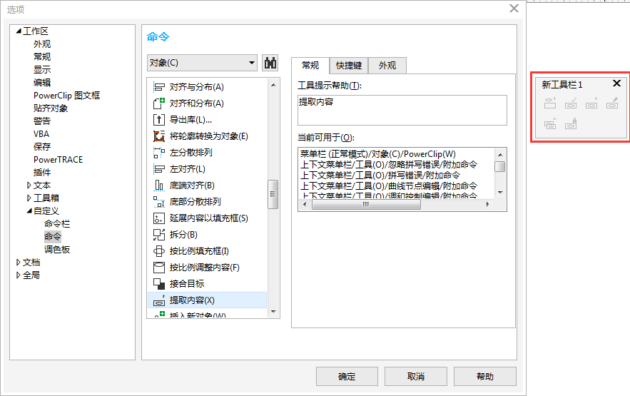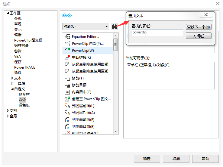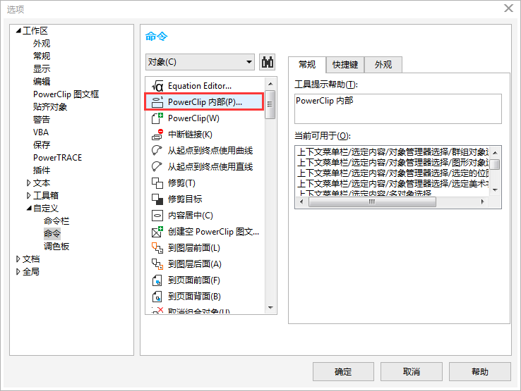 3. 在對象下拉菜單中找到你要自定義的工具,這里以“PowerClip”及相關拓展工具為例。