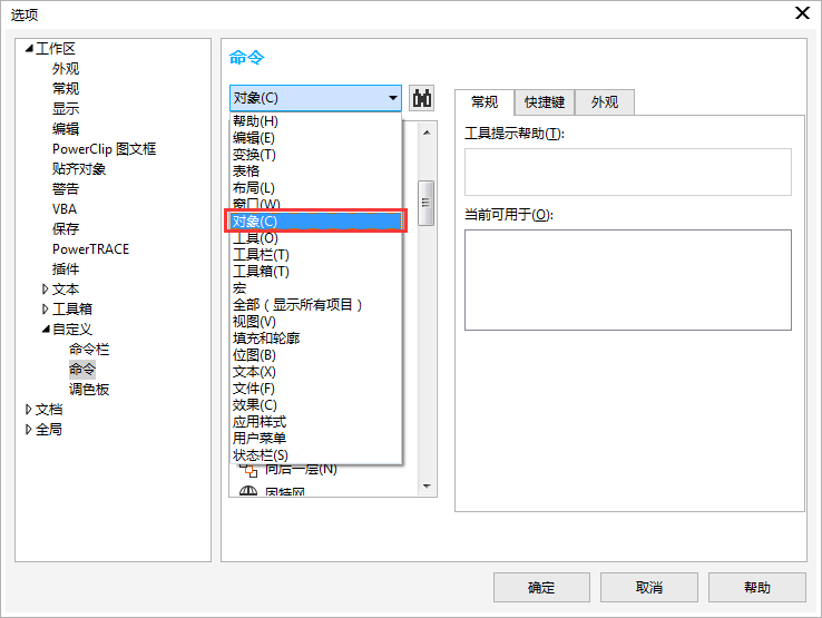 2. 在彈出的“選項”對話框中,單擊“命令”選項,右側展開“命令”子面板對話框,點擊展開命令下方小三角圖標,選擇“對象”選項,如圖。