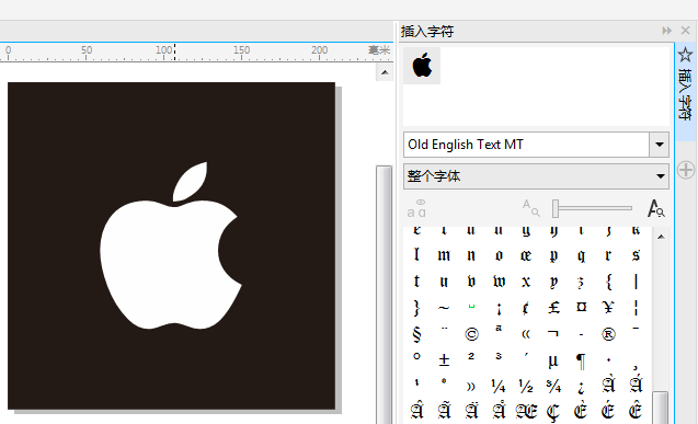 5. 找到想要的字符,雙擊可以顯示在頁面中心位置,或者您也可以拖拽到頁面任意位置,如下圖所示,就是利用“插入字符”繪制的蘋果Logo。