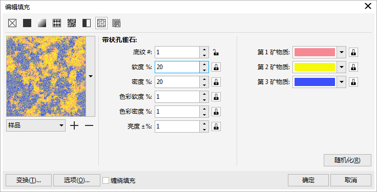 執行“窗口>泊塢窗>對象屬性”命令,在打開的“對象屬性泊塢窗”中選擇“填充>雙色圖樣填充>底紋填充”一樣可以對選中的對象進行底紋填充的編輯。