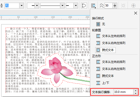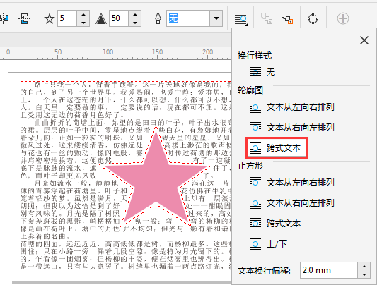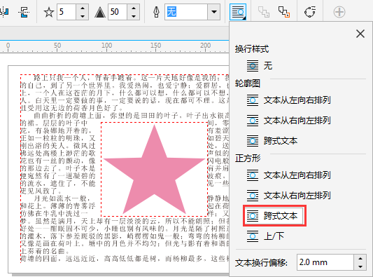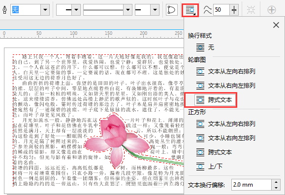 5. 選擇圖片,單擊屬性欄上的“文本換行”命令,此時會彈出關于“文本換行”的各種設置,選擇使用“輪廓圖>跨式文本”樣式,默認“文本換行偏移”為2.0mm,得到的效果如圖所示。