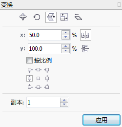 步驟六 取消勾選“縮放和鏡像”對話框中的“按比例”,將X數值改為50,即寬度縮小50%,Y數值不變,即高度不變。
