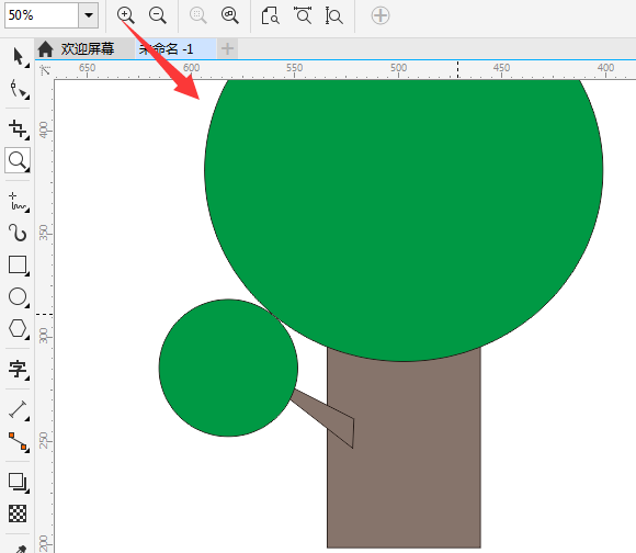 2、如圖所示,點(diǎn)擊屬性欄“放大”按鈕,則會(huì)看到CDR工作區(qū)所繪制的小樹(shù)被放大了,或通過(guò)左右側(cè)縮放級(jí)別進(jìn)行查看。