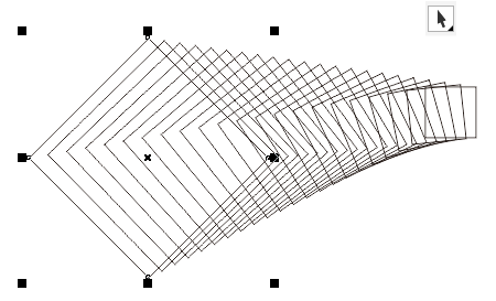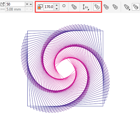 在屬性欄中,調整其步數為50,設置調和旋轉角度為170度,選擇直接調和,設置好這些屬性之后,呈現效果如圖所。