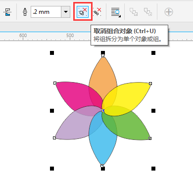 1. 取消編組也是在選擇工具屬性欄中以按鈕形式顯示,它的快捷鍵是Ctrl+U,如下圖所示。