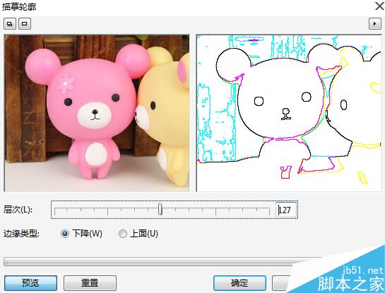 邊緣檢測:“邊緣檢測”濾鏡可以查找位圖圖像中的邊緣并勾畫出對象輪廓,此濾鏡適合高對比的位圖圖像的輪廓查找。