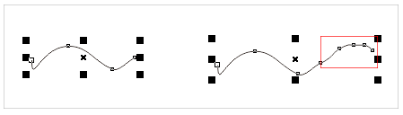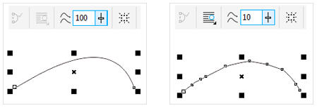 在屬性欄的手繪平滑框中鍵入一個值。值越大,產生的曲線越平滑,如下圖(左)所示平滑度為100,顯示線條節點很少。如下圖(右)所示平滑度為10,顯示線條節點較多。