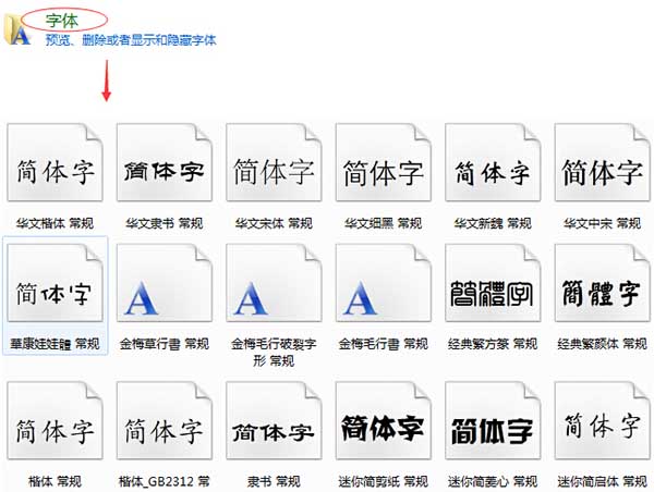 步驟三:接著找到"字體"雙擊打開,當打開字體面板的時候,我們就會看到里面有很多系統自帶的或者我們以前安裝過的字體,這里就是存儲安裝的字體的位置。如圖: