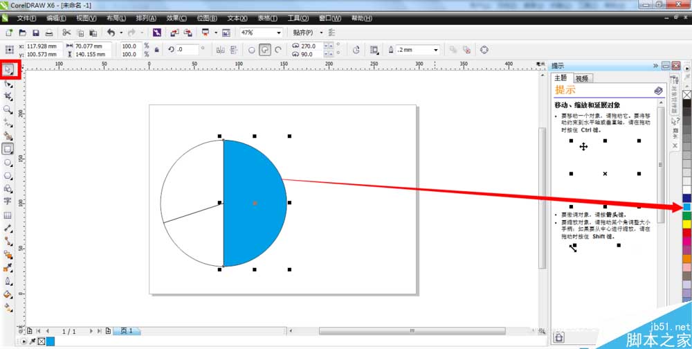 2、使用選擇工具,單擊選擇其他的一部分,然后鼠標左鍵點擊軟件界面的最右邊的顏色選擇處,比如選擇餅形圖的右半部分,鼠標左鍵點擊選中青色,即可給圖形填充上青色了。