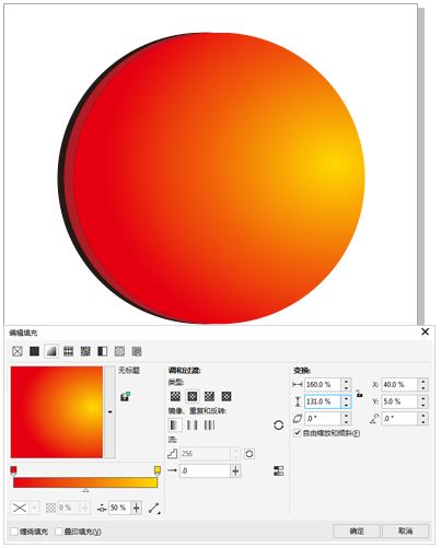 步驟二、復(fù)制并填充圖形 用同樣的方法在復(fù)制出一個(gè)正圓,并重新填充顏色,按“F11”鍵打開(kāi)選擇“漸變填充”的“編輯填充”對(duì)話(huà)框,在彈出的對(duì)話(huà)框中設(shè)置顏色參數(shù),填充效果如圖所示。