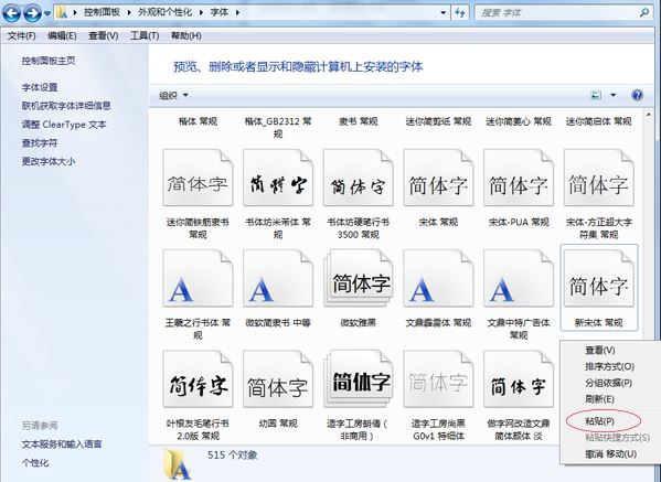 方法二:依次打開,我的電腦→C盤→“Windows”文件夾→“Fonts”字體文件夾后,選中從網上下載的字體,鼠標右鍵—復制,在“Fonts”文件夾中的空白處單擊鼠標右鍵—粘貼。