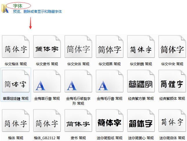 步驟三:接著找到“字體”雙擊打開,當打開字體面板的時候,我們就會看到里面有很多系統自帶的或者我們以前安裝過的字體,這里就是存儲安裝的字體的位置。如圖:
