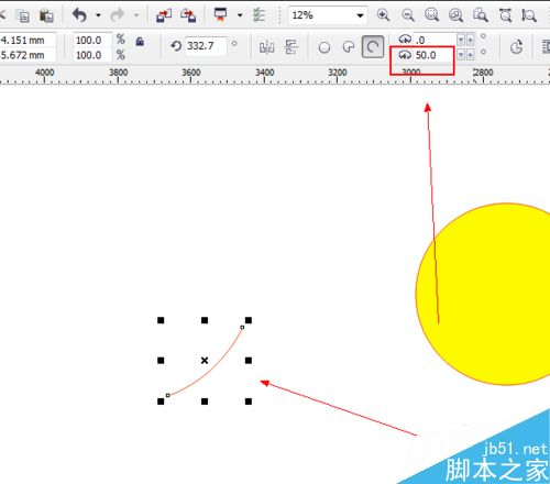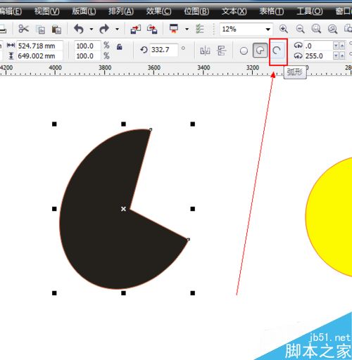 11、如圖所示,我們看到這個餅形變成了1/4的弧線了,同時我們通過改變箭頭所指的參數,調節弧線的弧度。