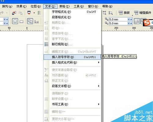 2、點擊菜單欄文本,插入字符符號。調出字符面板。