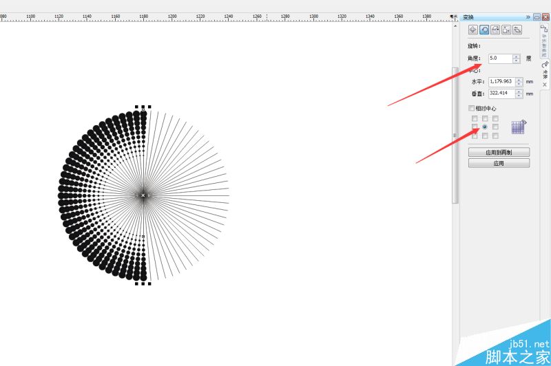 9,旋轉(zhuǎn)復(fù)制,根據(jù)自己的需要設(shè)置角度,這里設(shè)置5度,圍繞中心點(diǎn)旋轉(zhuǎn)復(fù)制。
