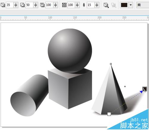 14、陰影制作 做其他幾何靜物的陰影,用“選擇工具”框選六角棱錐所有組成面,按Ctrl+G組合對象,然后使用“陰影工具”應用陰影效果,需要注意的是這個陰影是有深到淺的變化的,我們需要調整“陰影淡出”和“陰影的不透明度”的設置。