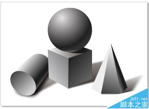 6、填充顏色 先做一個顏色填充的示范,你也可以把所有的幾何圖形擺列好位置,再填充。選擇工具箱中的“交互式填充工具”給正方體的其中一個面黑到灰的線性漸變填充,其他面做法類似。需要注意的是,素描中的明暗區域要表現到位,即有亮面、灰面和暗面的對比。