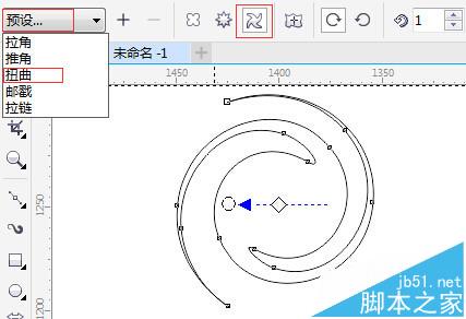 3、選中修剪后的半圓圖形,在選擇“變形工具”,在屬性欄的“預設”選項的下拉列表中選擇“扭曲”,并更改屬性欄中的設置,效果如圖所示: