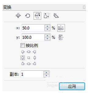 4、取消勾選“縮放和鏡像”對話框中的“按比例”,將X數(shù)值改為50,即寬度縮小50%,Y數(shù)值不變,即高度不變。