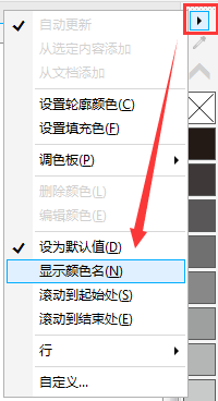 4、此外,通過(guò)單擊調(diào)色板頂部的選項(xiàng)展開(kāi)工具欄按鈕,并單擊顯示顏色名,還可以在色樣中顯示各種顏色名稱(chēng)。