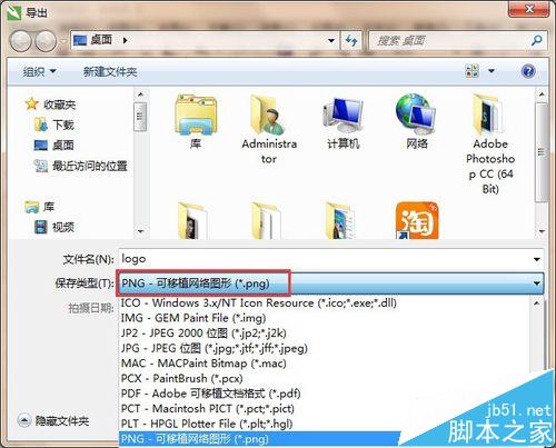 2、單擊“文件→導出”命令,在導出對話框中的文件類型中選擇“PNG”(或者PSD,TIFF),這些都是圖片透明格式。