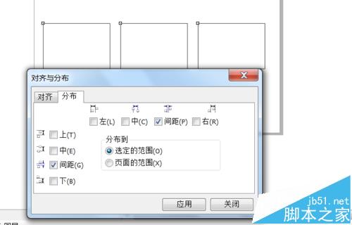 “分布”:和“對(duì)齊”一樣,橫向和縱向要選擇的對(duì)象不一樣,同樣可以通過(guò)“應(yīng)用”按鈕提前預(yù)覽效果。一般是選擇“間距”,意思是使排列的對(duì)象按同等距離進(jìn)行排列。