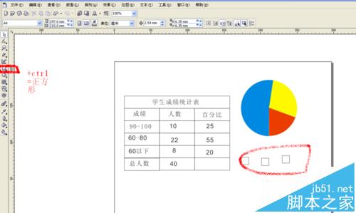 8、點擊矩形工具+ctrl鍵畫出正方形。用挑選工具選中做好的正方形,鼠標左擊拖動不放,在點擊右鍵即可復制。復制完成,點擊調色板,填充顏色,顏色與扇形顏色相同。用同樣方法把分段成績復制拖到正方形下方。