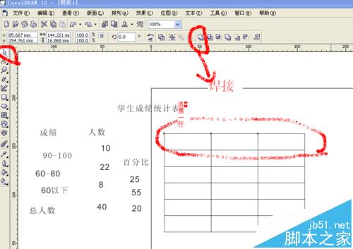 4、點擊挑選工具選擇第一行,點擊焊接,把矩形單元格焊接成一個大的矩形。