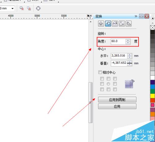 18、如圖所示,我們已經為花瓣的旋轉填一個合適的旋轉角度,以便讓花瓣以花蕊為中心旋轉復制,這里我們填寫為60度旋轉,之后我們點擊箭頭所指的的“應用到在制”按鈕,并連續按按5下。