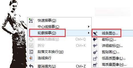 步驟二 從菜單欄,執行“位圖”→“輪廓描摹”→“線條圖”命令,或選中位圖圖片,鼠標右鍵,在彈出的快捷菜單中選擇“輪廓描摹”→“線條圖”。