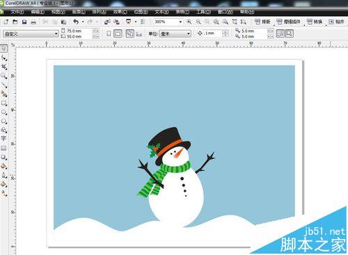 1、打開Colerdraw軟件,設定頁面尺寸為:75*55mm,并在頁面中央畫一矩形71*51mm作為,填充淺蘭色作為賀卡的底景。