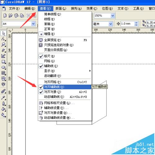 5、在上邊的標尺上拉出一條輔助線來。再點擊“查看”菜單,將“對齊輔助線”勾選上。