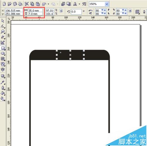 5、在手機的上面中間的位置,用矩形工具,畫一個寬為35mm,高為7mm的長方形,并設置長方形的圓角值為100,再填充白色。