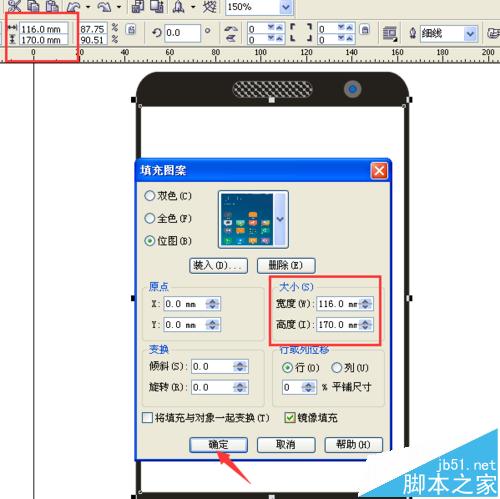 21、設置圖片大小寬度為116mm,高度為170mm,也就是和白色長方形的尺寸一樣大小,再點擊確定。