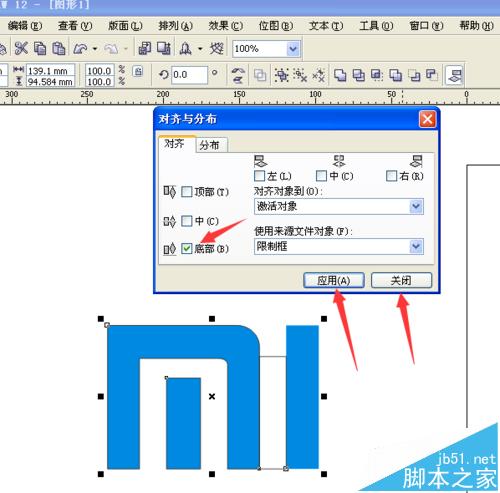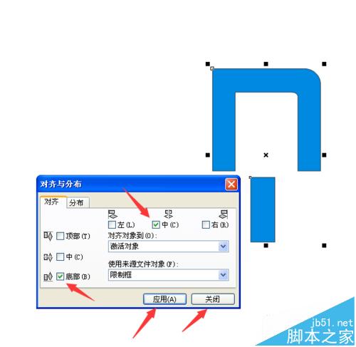 5、用挑選工具,把兩個圖形都選擇上,再點擊上邊屬性欄的”對齊和屬性“按鍵。將左右居中勾選上,將底部對齊也勾選上,再點擊應用,最后點擊關閉。