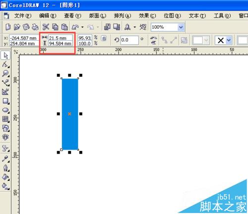 9、再用矩形工具畫出一個寬度為21.5mm,高度為94.584mm的長方形,并且填充為藍色。