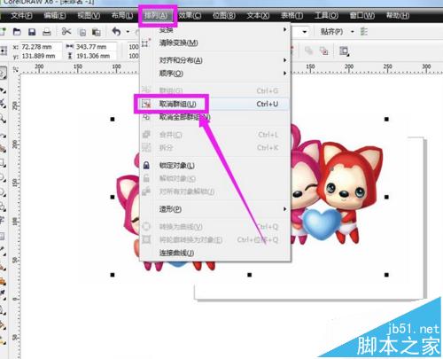 6、得到扣除了白色背景的圖片以后點(diǎn)擊菜單欄里的”排列“,然后在它的下拉列表里再選擇”取消群組“。