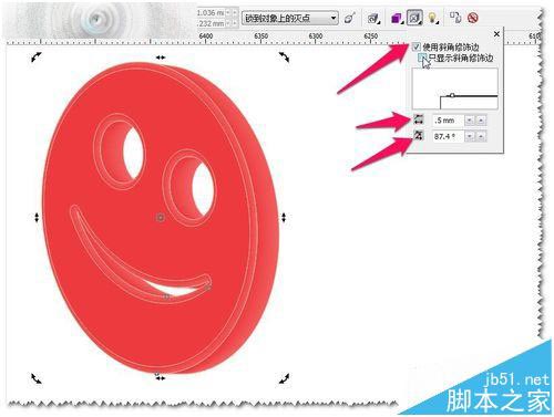 9、使用立體化工具——斜角修飾邊工具——做出斜角并調(diào)節(jié)好參數(shù)——達到滿意效果為至。如圖