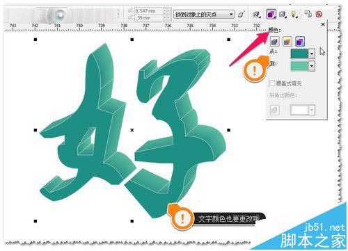 8、然后對(duì)立體文字進(jìn)行顏色的設(shè)置更改——選擇立體化工具中的顏色——使用遞減的顏色——原始文字的顏色也進(jìn)行更改。如圖
